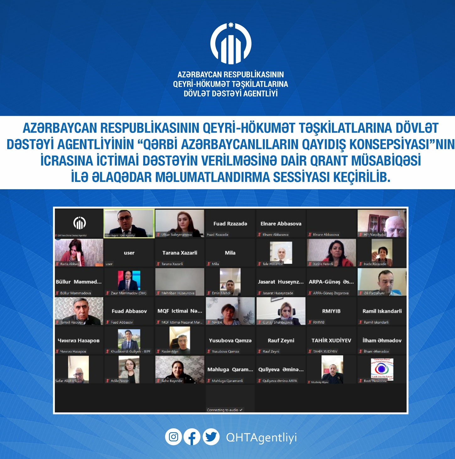 Azərbaycan Respublikasının Qeyri-Hökumət Təşkilatlarına Dövlət Dəstəyi Agentliyinin “Qərbi Azərbaycanlıların Qayıdış Konsepsiyası”nın icrasına ictimai dəstəyin verilməsinə dair qrant müsabiqəsi ilə əlaqədar məlumatlandırma sessiyası keçirilib.