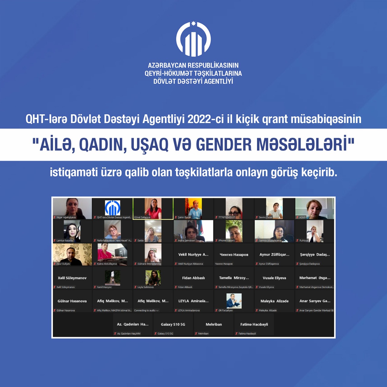 "Ailə, qadın, uşaq və gender məsələləri" istiqaməti üzrə qalib olan təşkilatlarla onlayn görüş keçirib.