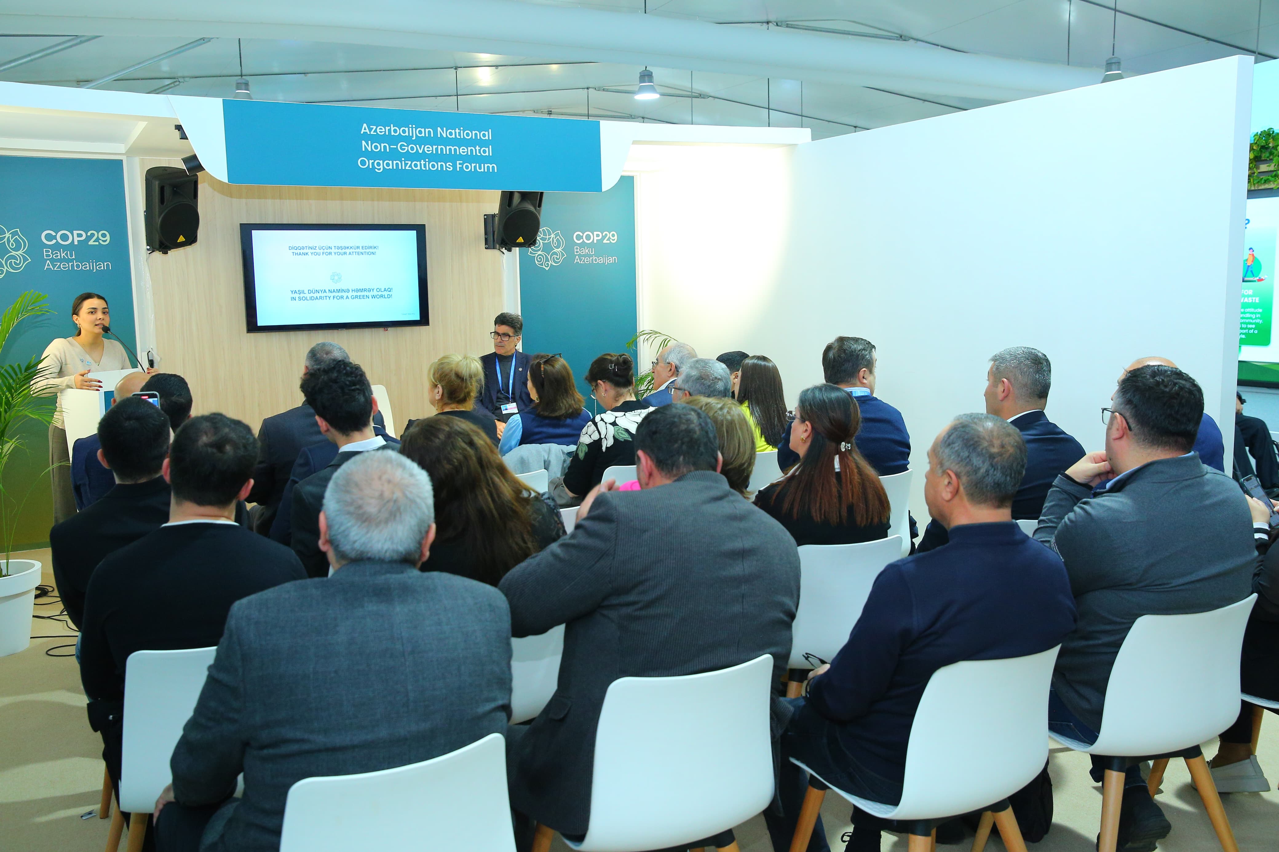 2024-cü il noyabrın 12-də COP29 çərçivəsində Yaşıl Zonada yerləşən Milli QHT Forumu Pavilyonunda "Ümid" Sosial İnkişafa Dəstək İctimai Birliyi "Suvarma və içməli su təchizatı üçün icma səviyyəli həll variantları" mövzusunda panel müzakirəsi təşkil edib.