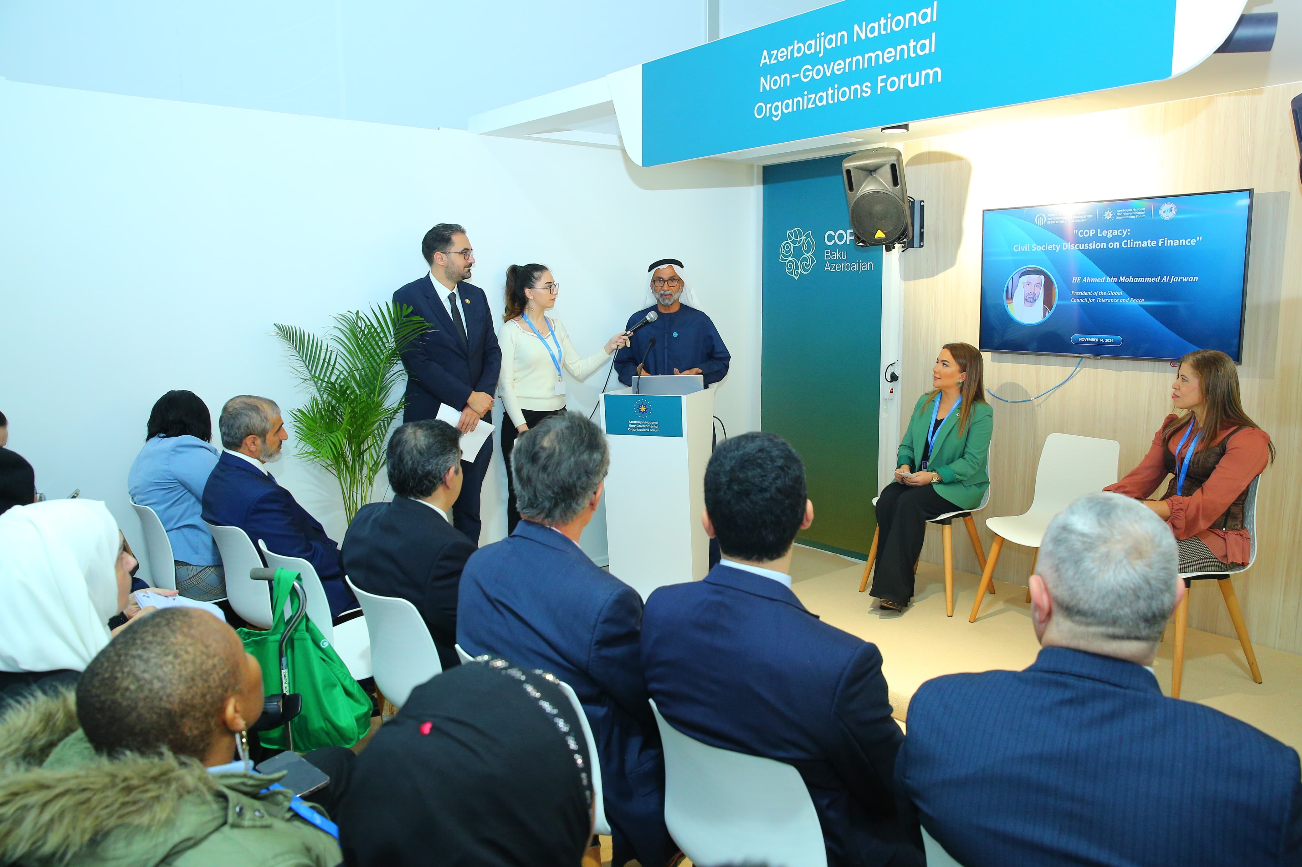 Birləşmiş Ərəb Əmirliklərinin Tolerantlıq və Sülh Uğrunda Qlobal Şurasının sədri Ahmed Mohamed Aljarvan COP28 zamanı QHT-lərin iqlim maliyyəsi ilə əlaqədar təşəbbüslərinə toxunub, vacib məqamların inkişaf etdirilməsinin əhəmiyyətini qeyd edib.