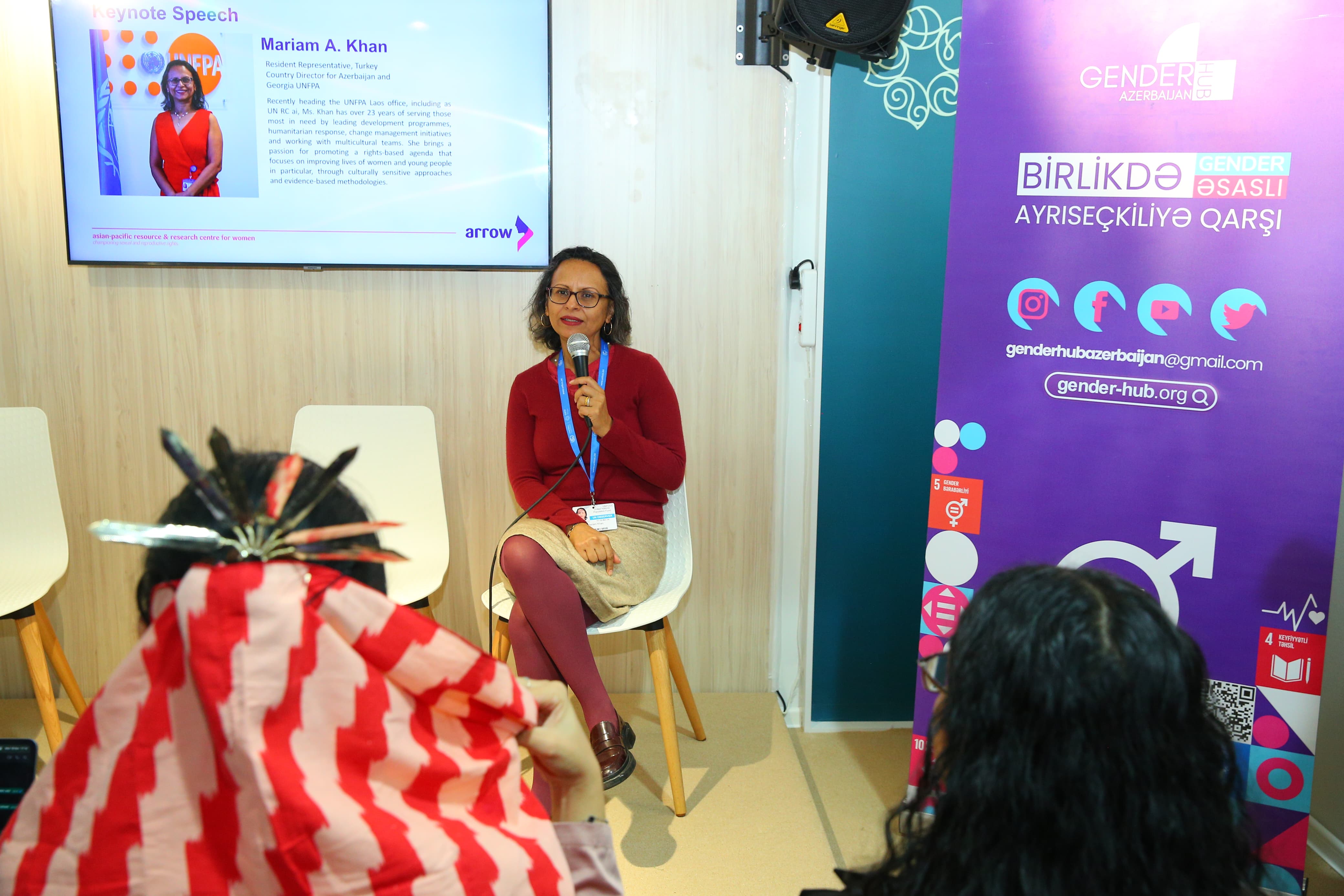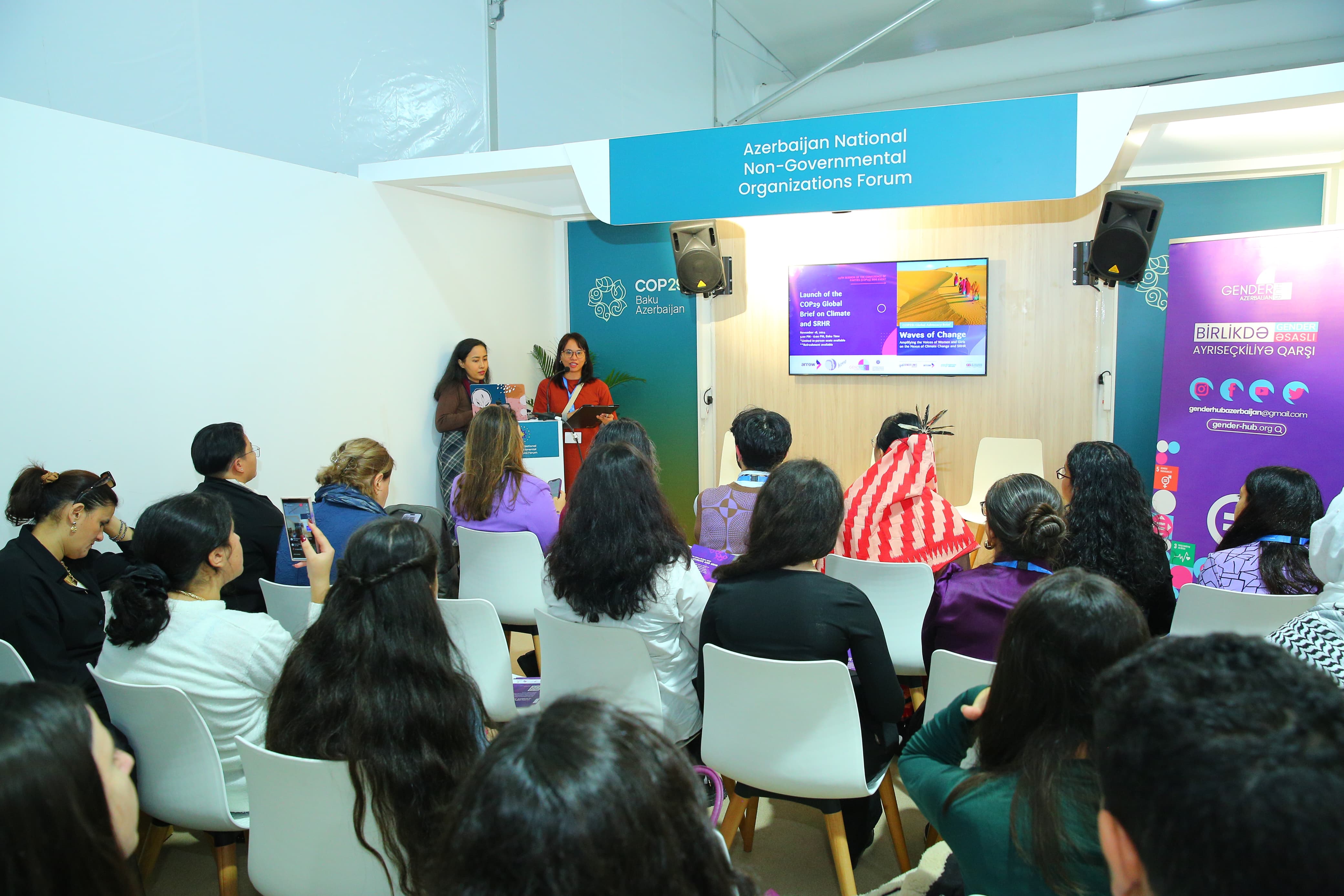 2024-cü il noyabrın 18-də COP29 çərçivəsində Milli QHT Forumu Pavilyonunda “İqlim dəyişmələrinin reproduktiv sağlamlıq hüquqlarına təsiri ilə əlaqəli COP29 Qlobal Xülasəsi”nin təqdimatı keçirilib. Təqdimatı Asiya-Sakit Okean Qadın Resurs və Tədqiqat Mərkəzi (ARROW), “Gender Hub Azərbaycan” və “Cənub Qadınlarının Səsi” (WOSSO) təşkilatı birgə təşkil edib.