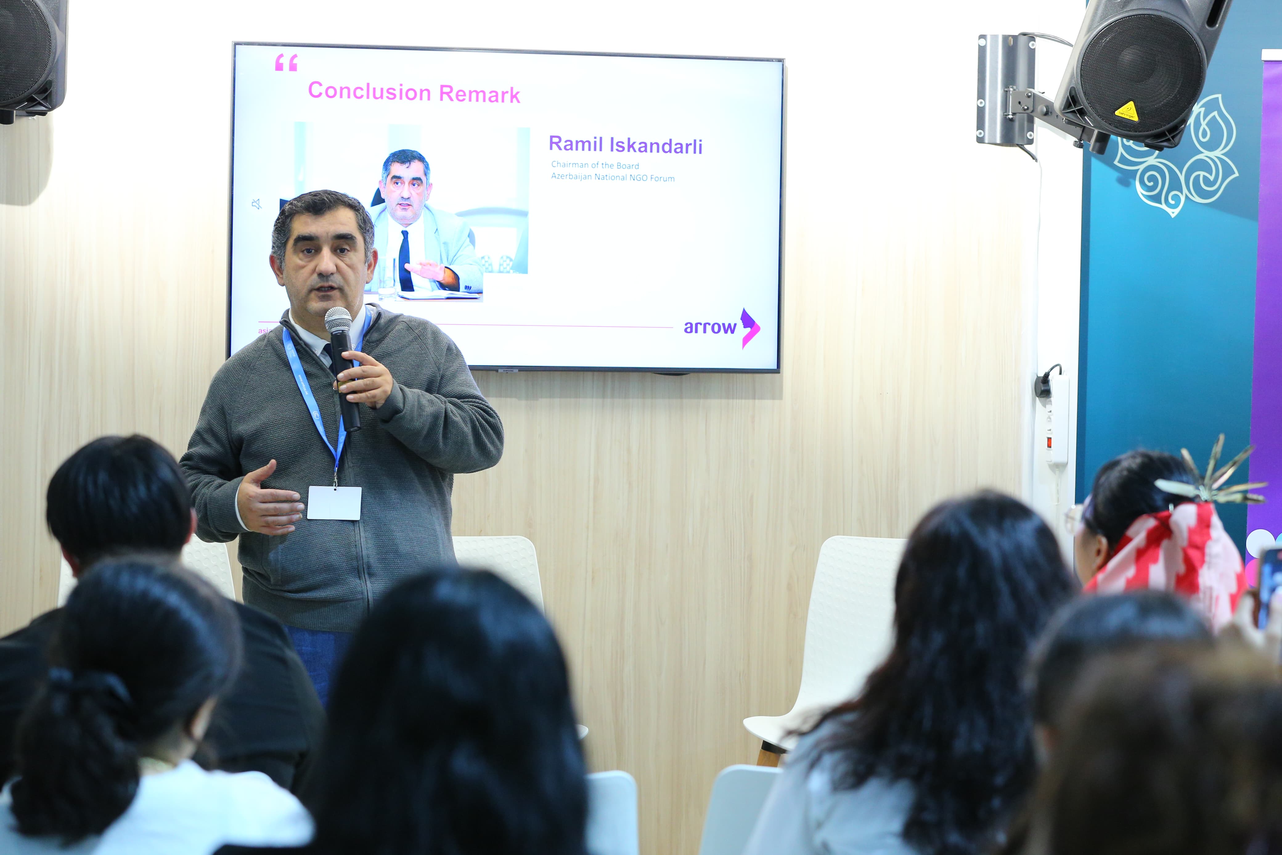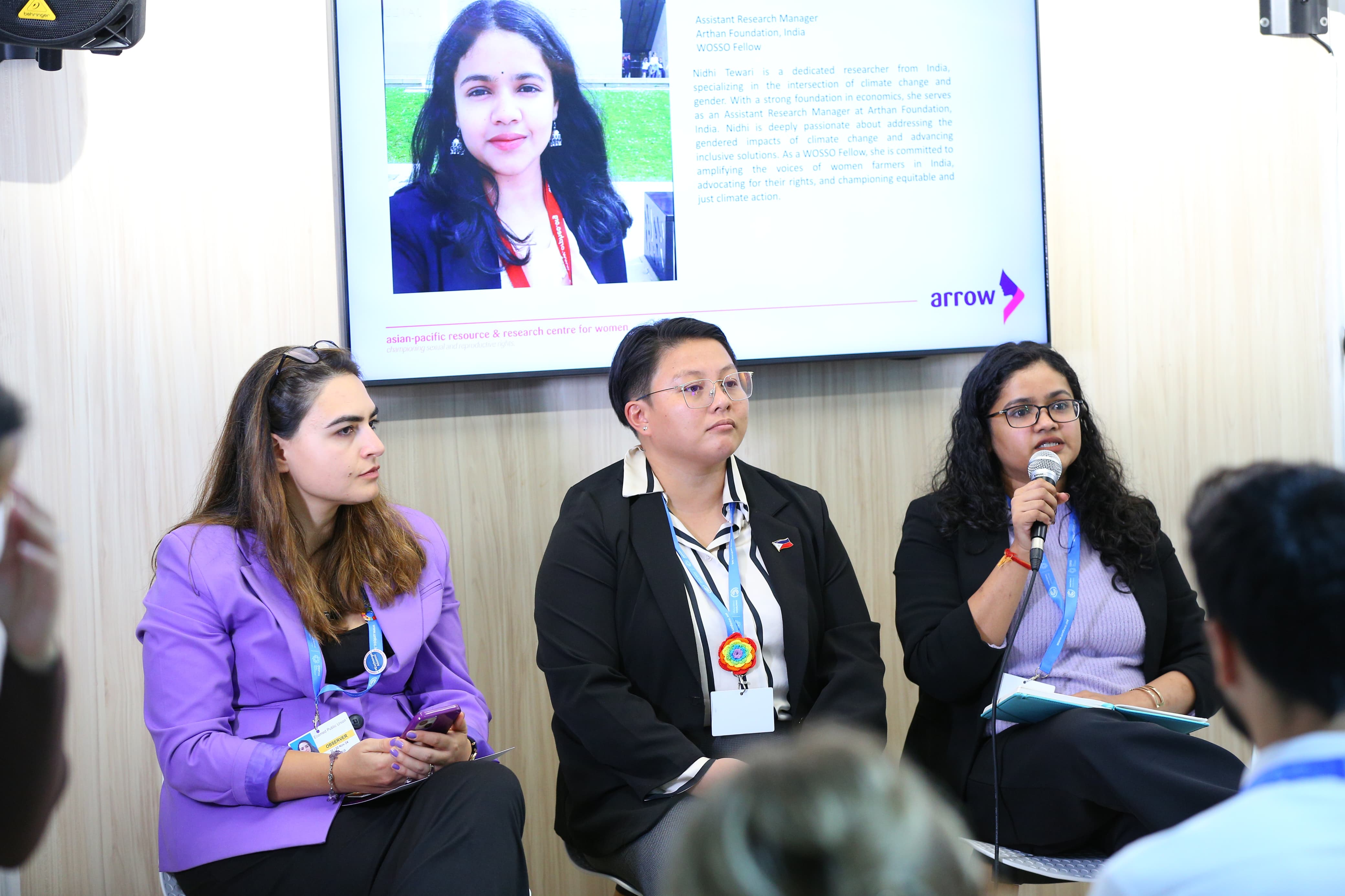 ARROW-nun baş proqram rəhbəri Danika Kastillonun moderatorluğu ilə keçirilən panel müzakirəsində BMT-nin Əhali Fondunun (UNFPA) Türkiyə üzrə nümayəndəsi, Azərbaycan və Gürcüstan üzrə direktoru Mariam A.Xan, WOSSO-nun nümayəndəsi Fitriyyə İskəndər, ARROW proqram rəhbəri Sanskriti Şresta iqlim və reproduktiv sağlamlıq məsələləri mövzusunda müzakirələr aparıb.