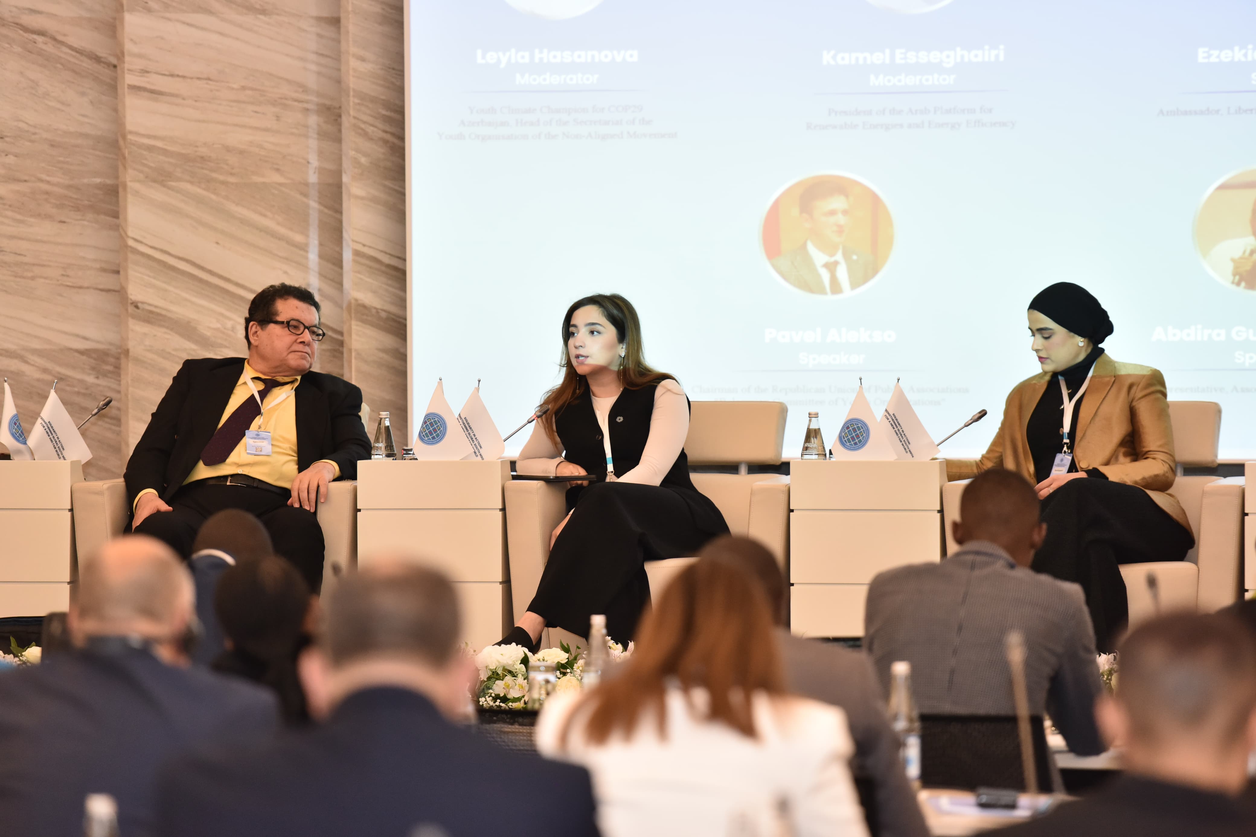 Müzakirələrin moderatorları Qoşulmama Hərəkatı Gənclər Təşkilatının Baş katibi, COP29-un Gənc İqlim Çempionu Leyla Həsənova və Bərpa Olunan Enerji və Enerji Səmərəliliyi üzrə Ərəb Platformasının prezidenti Kamel Esseqayri (Kamel Esseghairi) olub.