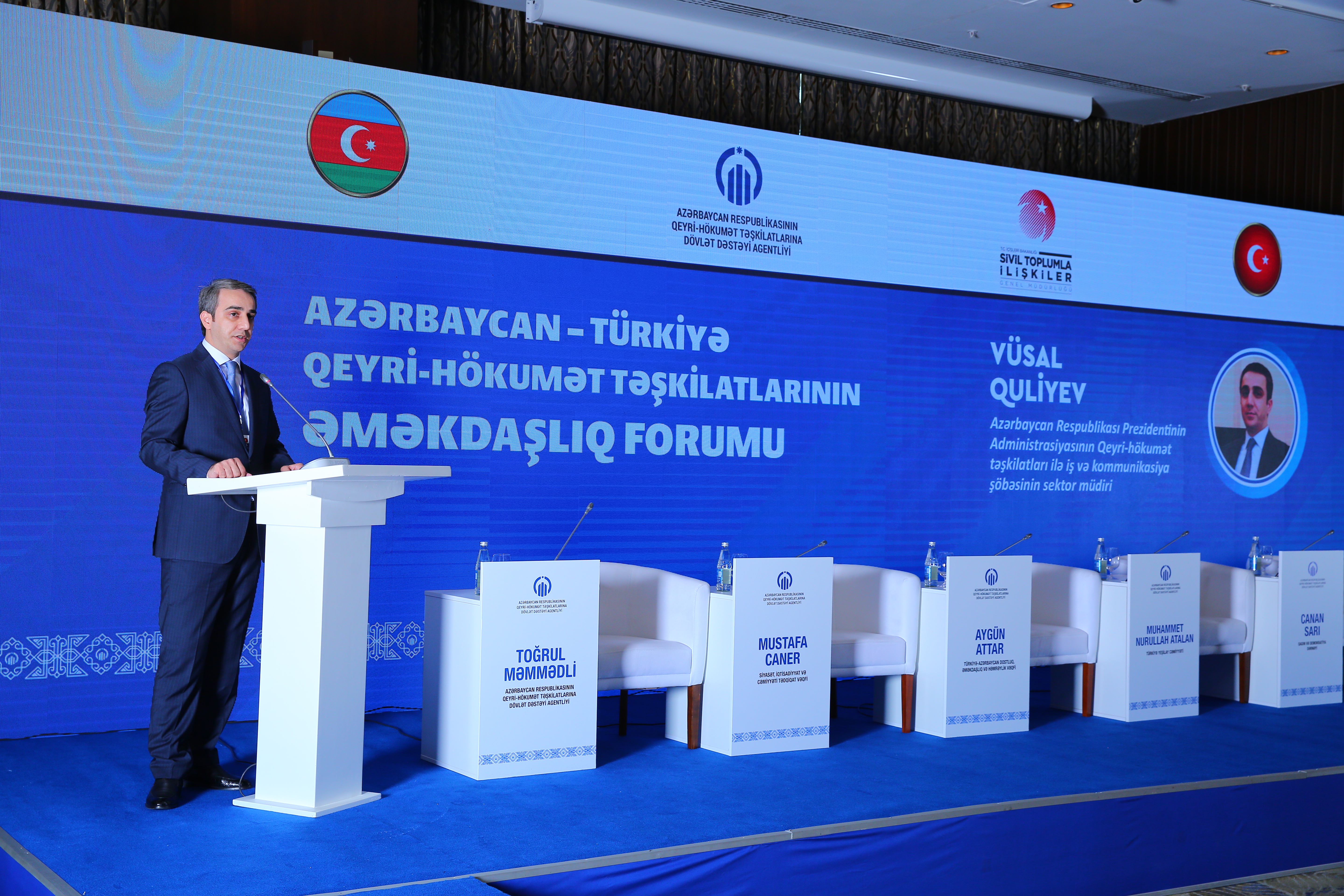 Sonra çıxış edən Prezident Administrasiyasının Qeyri-hökumət təşkilatları ilə iş və kommunikasiya şöbəsinin sektor müdiri Vüsal Quliyev bildirib ki, Azərbaycan müstəqilliyini bərpa etdikdən sonra vətəndaş cəmiyyəti institutları ölkənin iqtisadi, sosial və mədəni həyatında mühüm rol oynayıb. QHT-lərə Dövlət Dəstəyi Agentliyinin yaradılması dövlətlə QHT-lər arasında əməkdaşlığın inkişafının bir nümunəsinə çevrilib. Buna görə də dövlət orqanlarının QHT-lərlə yaxından əməkdaşlıq etməsi, qərarların qəbulu və sifarişlərin icrası prosesində onların iştirakına şərait yaradılması mühüm əhəmiyyət kəsb edir. Azərbaycan dövləti ölkədə fəaliyyət göstərən vətəndaş cəmiyyəti institutlarının, o cümlədən qeyri-hökumət təşkilatlarının formalaşmasına və inkişafına daim ciddi önəm verir. Hazırda ölkədə ictimai təşkilatların fəaliyyətini tənzimləyən əlverişli hüquqi baza mövcuddur. O cümlədən, Vüsal Quliyev bildirib ki, 2022-ci il “Şuşa ili” çərçivəsində Əməkdaşlıq forumunun keçirilməsi Azərbaycanın ictimai-siyasi həyatında tarixi hadisədir. Çünki ilk dəfə hər iki ölkənin dövlət qurumlarının dəstəyi və vətəndaş cəmiyyətinin iştirakı ilə belə bir tədbir keçirilir. Artıq bu forum iki ölkənin vətəndaş cəmiyyəti qurumlarının fəaliyyətini sistemli şəkildə əlaqələndirəcək, ortaq layihələr reallaşdırılacaq, təcrübə və informasiya mübadilələri həyata keçiriləcək. Gələcəkdə bu təşəbbüslərin Türk Dövlətləri Təşkilatları çərçivəsində də reallaşdırılması Türk dünyası vətəndaş cəmiyyətinin bir araya gəlməsi və əməkdaşlıq baxımından faydalı ola bilər.