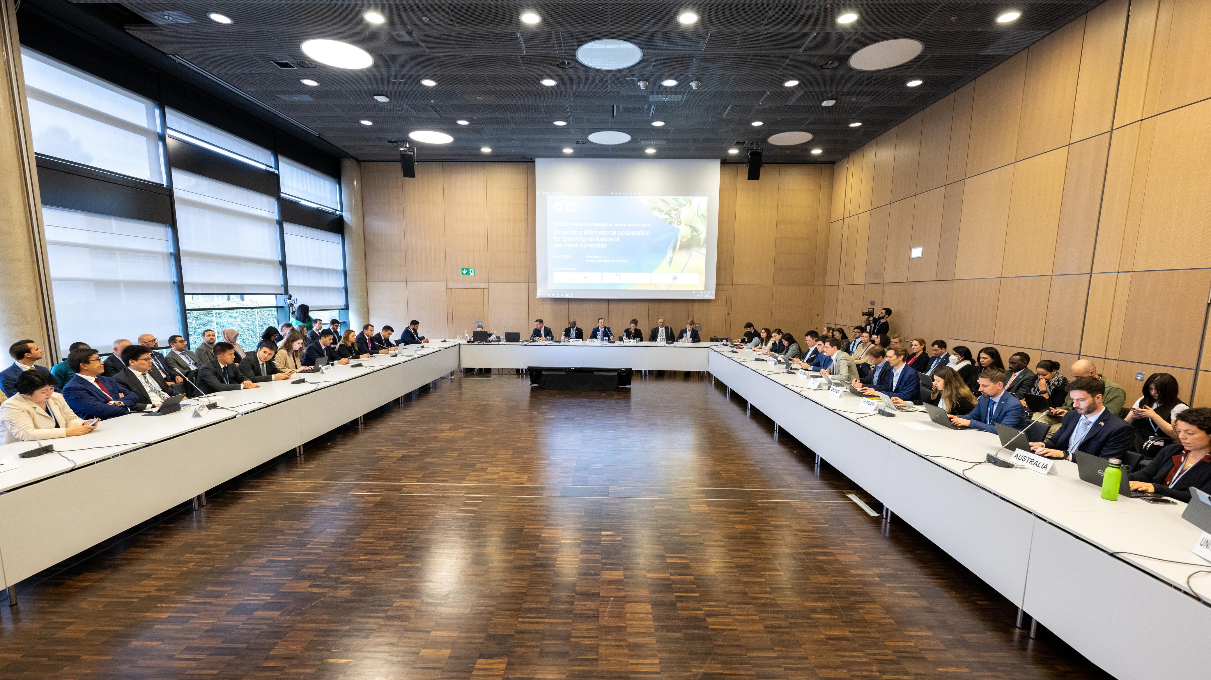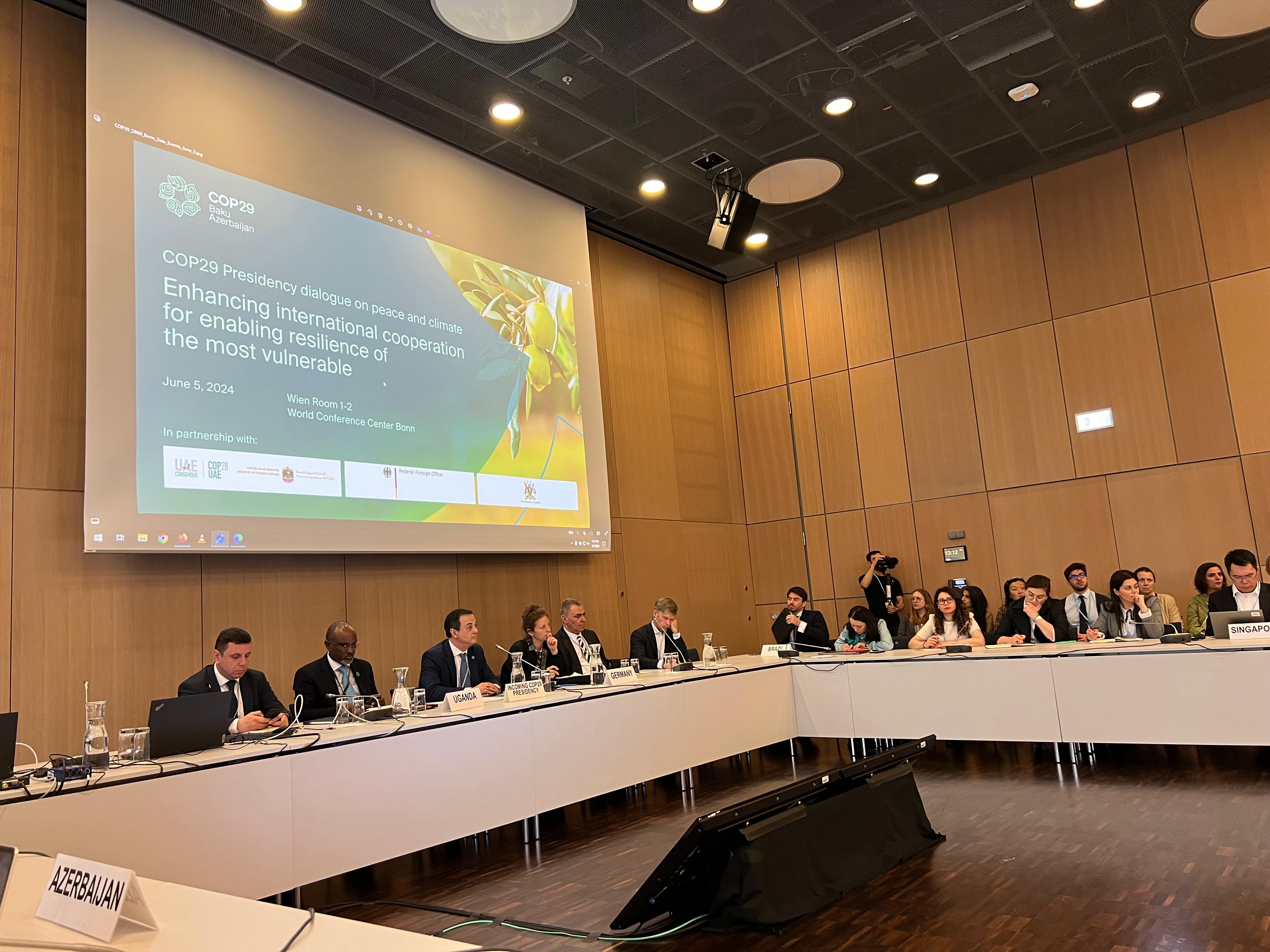 Konfrans çərçivəsində iyunun 5-də Azərbaycanın COP29-un sədri kimi “Sülh və iqlim dialoqu” mövzusunda tədbiri təşkil edilib. Azərbaycanın COP29-da “Sülh və iqlim qovşağı” mövzusuna diqqəti BMT-nin İqlim Konfransında yüksək maraqla qarşılanıb.