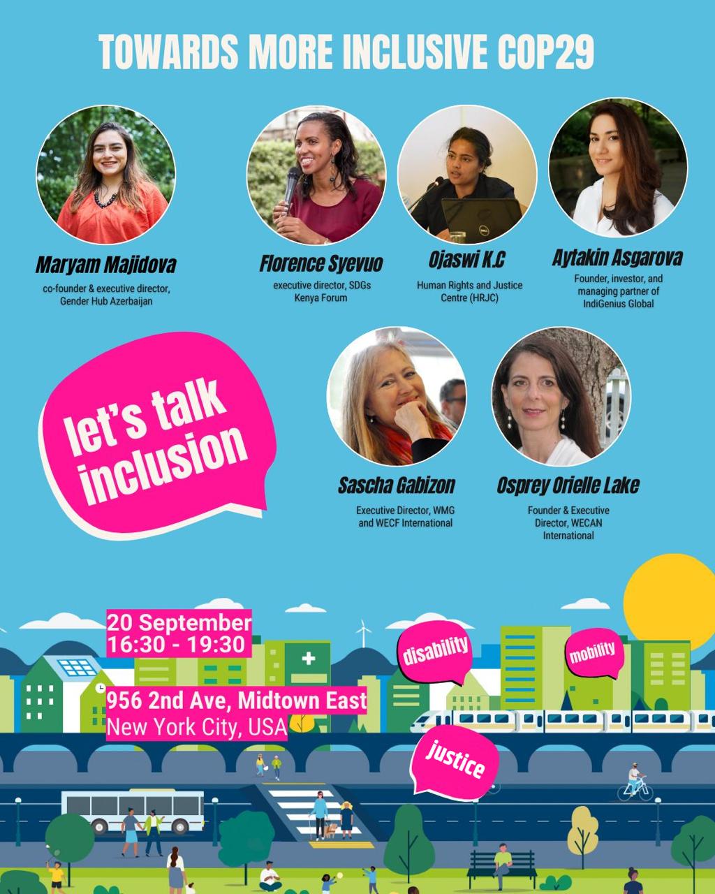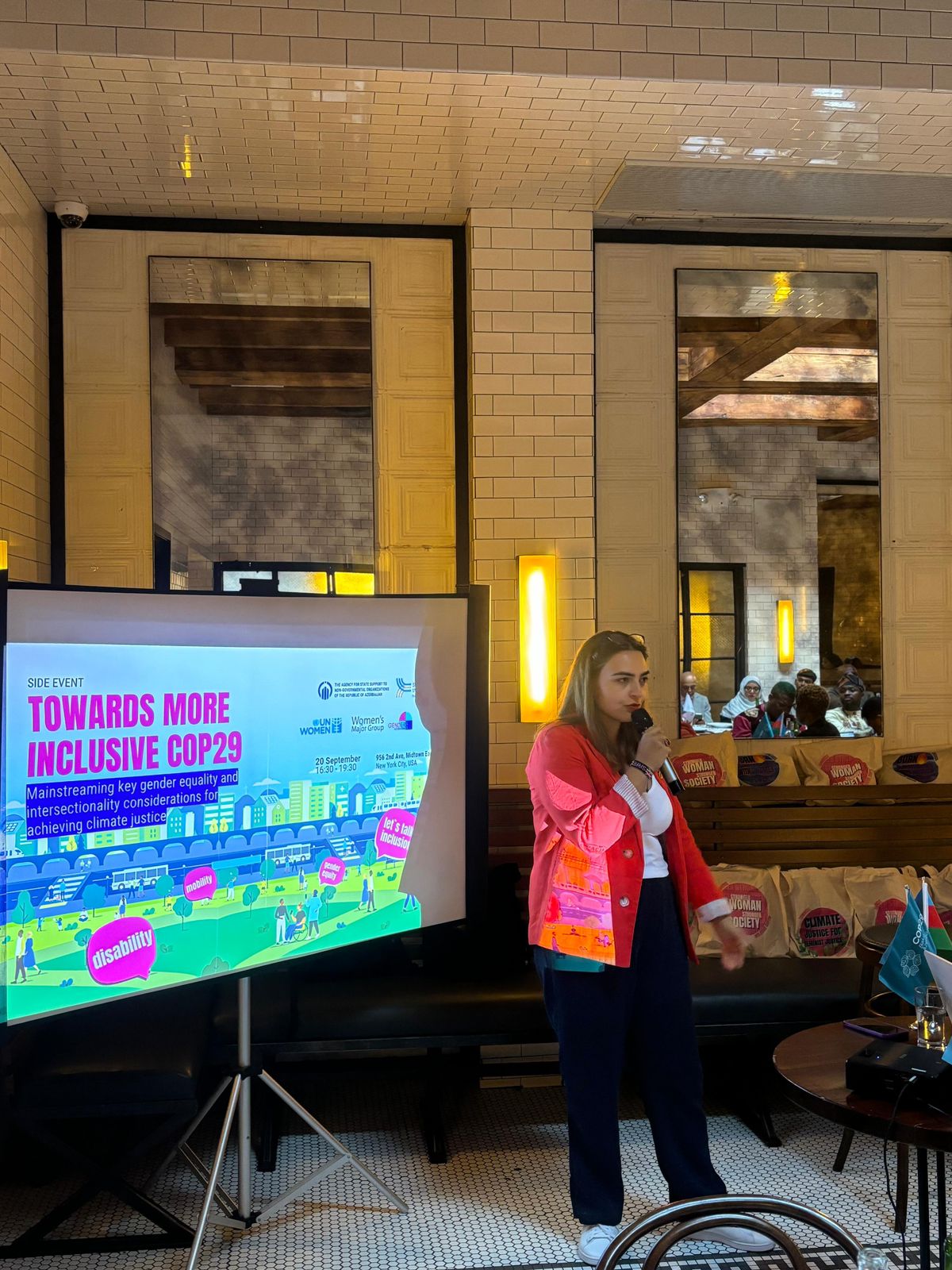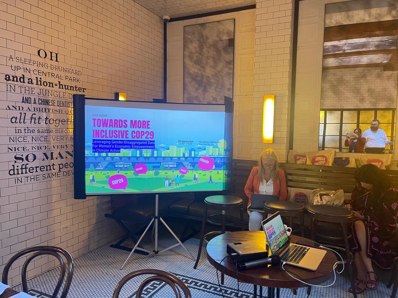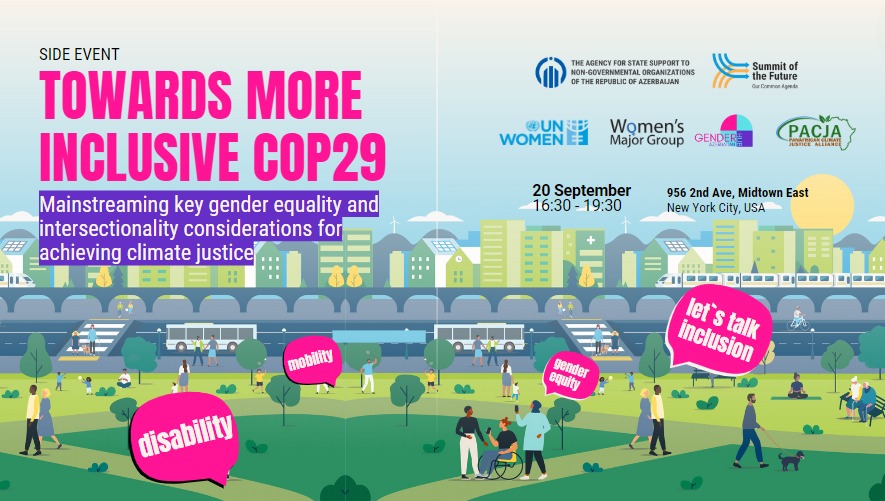 BMT-nin “Gələcəyin Sammiti” çərçivəsində 20 sentyabr 2024-cü ildə Nyu-Yorkda Pan-Afrika İqlim Ədaləti Alyansı (PACJA) və Azərbaycan Gənclərinin Gender Bərabərliyi Mərkəzi “Gender Hub” İctimai Birliyinin birgə təşkilatçılığı ilə “Daha inklüziv COP29-a doğru: iqlim ədalətinə nail olmaq üçün gender bərabərliyi və sahələrarası uzlaşma üzrə əsas meyillərin ümumi axına qoşulması” mövzusunda yan tədbir təşkil olunub. Yan tədbirin tərəfdaşları BMT-nin Qadınlar Təşkilatı (UN Women), Qadınların Əsas Qrupu (Women Major Group), Azərbaycan Respublikasının BMT yanında Daimi Nümayəndəliyi, Qeyri-Hökumət Təşkilatlarına Dövlət Dəstəyi Agentliyi olub.